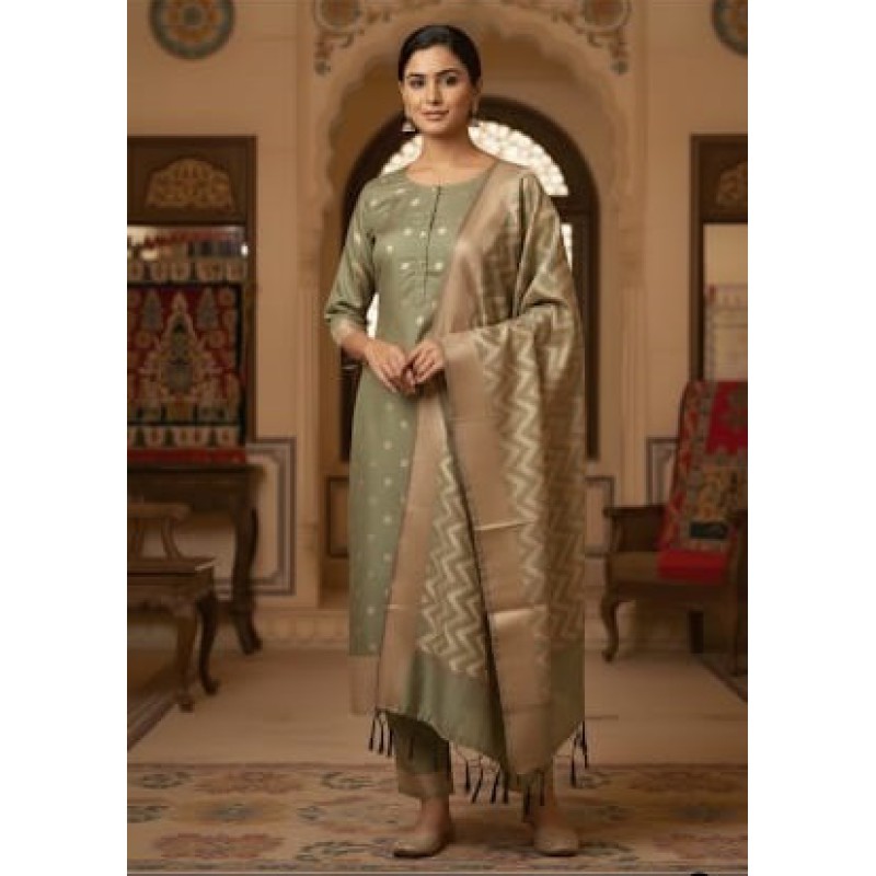 Silk Banarasi Suit – Grace Woven in Tradition Add a royal touch to your wardrobe with this exquis..
