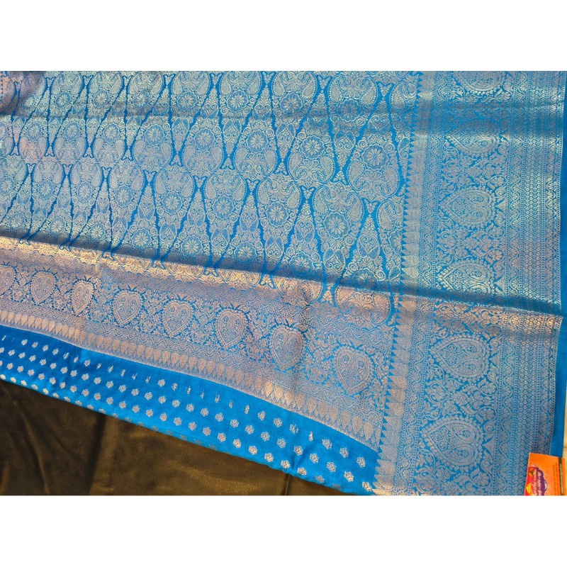 “Pure Banarasi chiffon silk saree – adorned with traditional Banarasi weaving and golden zari, this saree is extremely lightweight and comfortable. Experience the unmatched charm where artistry meets royalty. Perfect choice for festive seasons, parties, and weddings! Available in attractive colors and patterns. Order now to add a royal touch to your elegance!