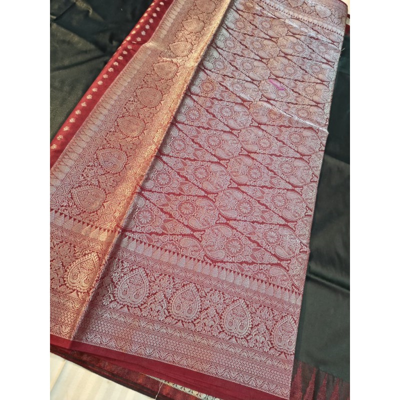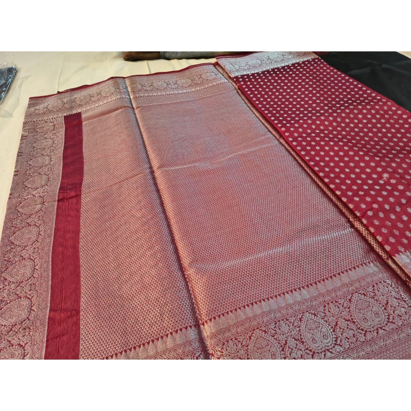 “Pure Banarasi chiffon saree – adorned with traditional Banarasi weaving and silver zari, this saree..