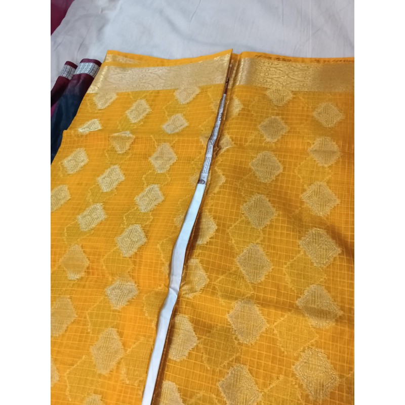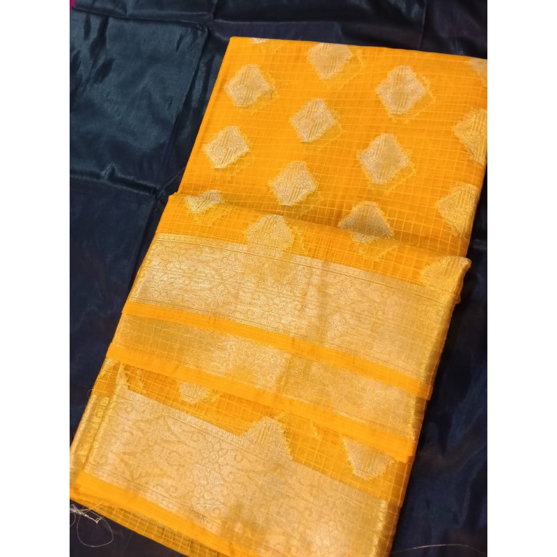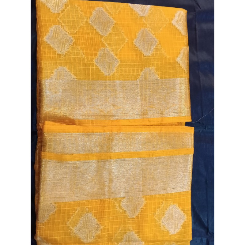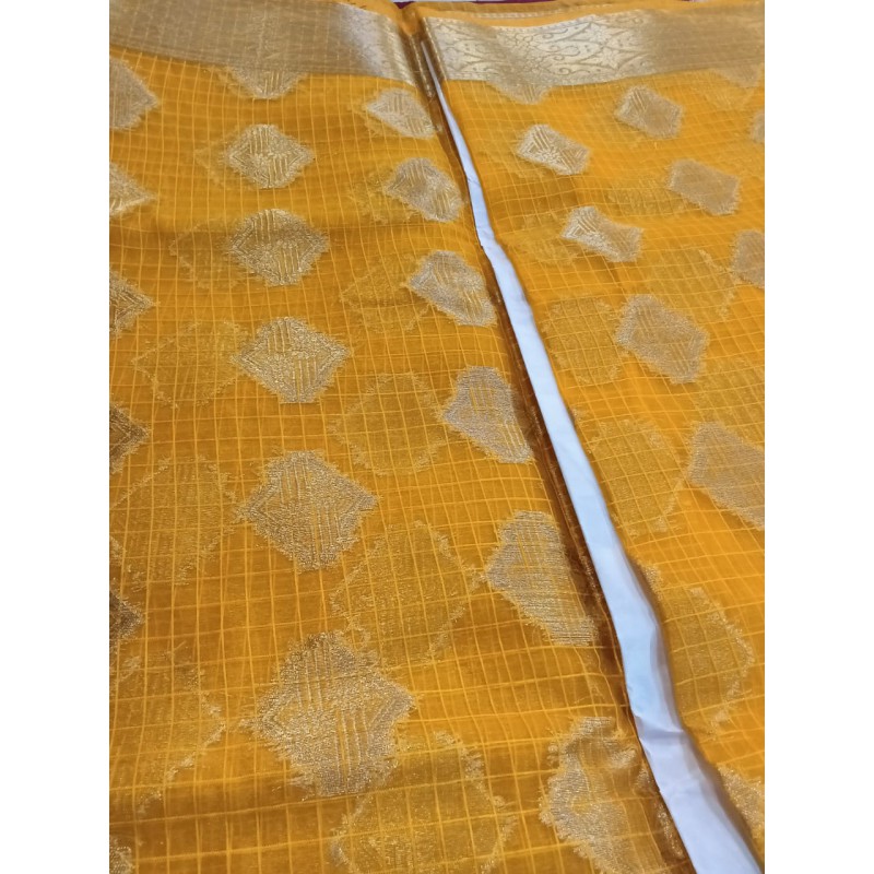 This appears to be a yellow saree (Indian traditional garment) with a silver zari border and a checkered pattern featuring diamond-shaped motifs (buttas). The fabric appears to be a lightweight silk blend, possibly organza mix, kota silk, or art silk, known for its sheer appearance and elegant drape.