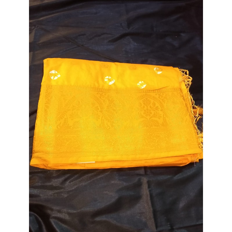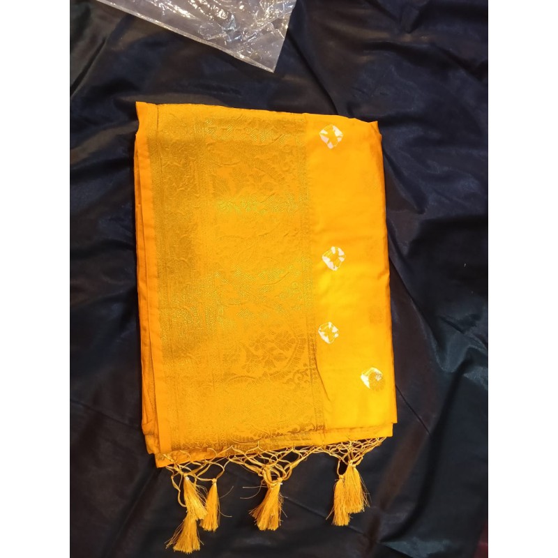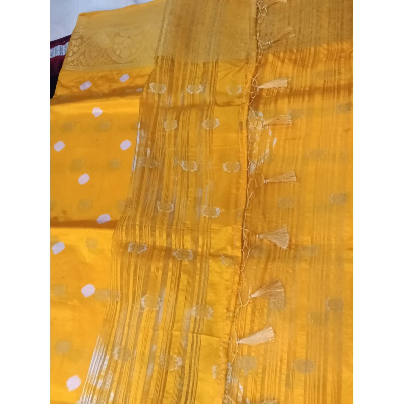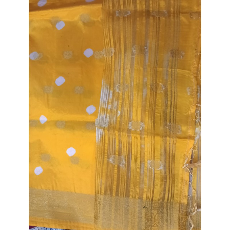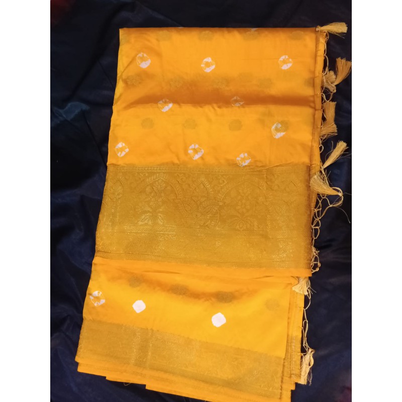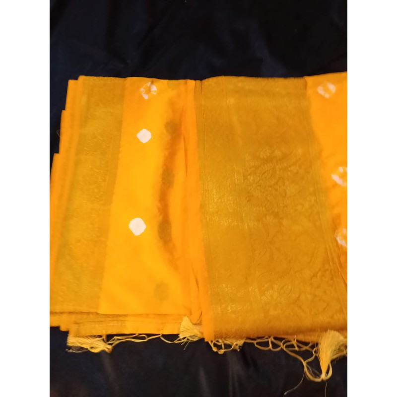 Bandhani boota refers to small motifs created using the traditional Indian tie-and-dye (resist-dyeing) technique known as Bandhani or Bandhej. When used in a Banarasi saree context, this describes a specific type of high-quality textile that merges two distinct Indian handloom traditions: the intricate Bandhani tie-dye work, typically from Gujarat and Rajasthan, with the rich, often zari-brocade, weaving heritage of Banaras (Varanasi).