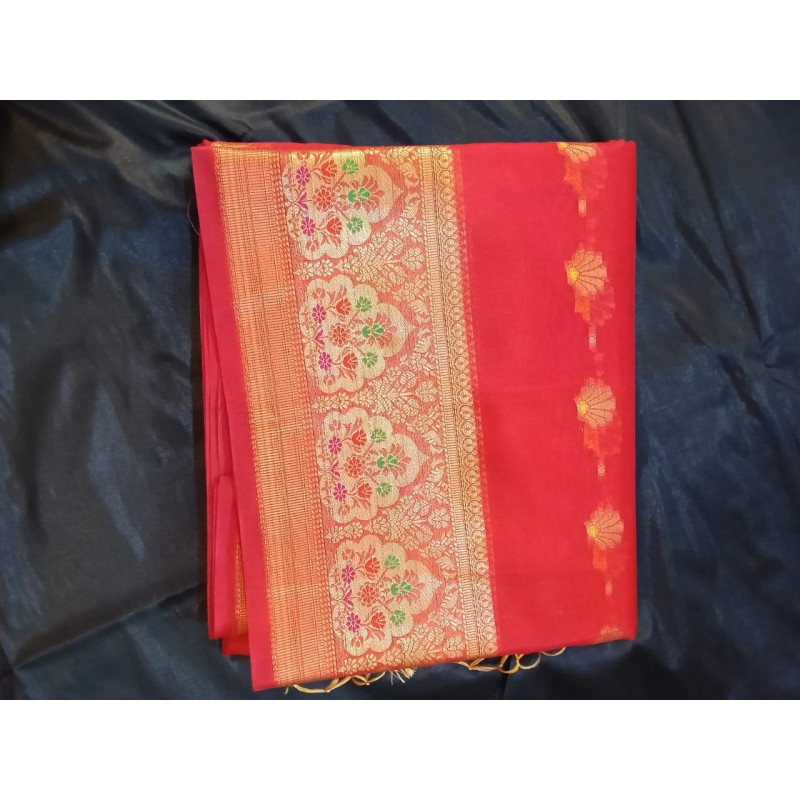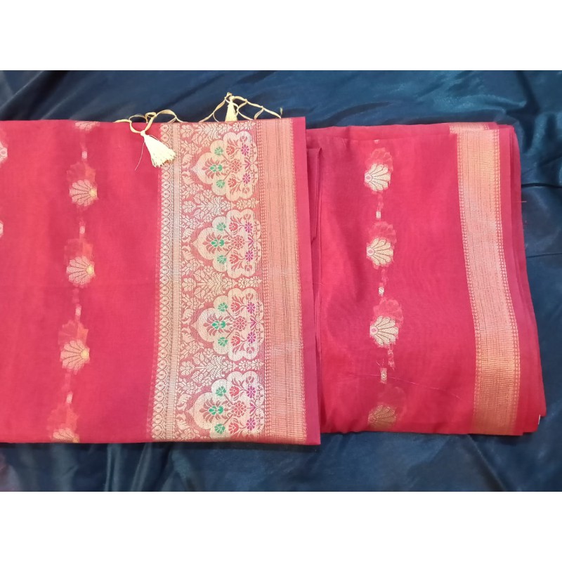 - Fabric: Authentic, high-quality versions usually utilize premium fabrics like pure khaddi georgette or pure silk as a base, known for their luxurious texture and drape. The item in the image appears to be a Chanderi silk-cotton blend, which is a lighter, more transparent fabric often associated with Banarasi weaving techniques as well.