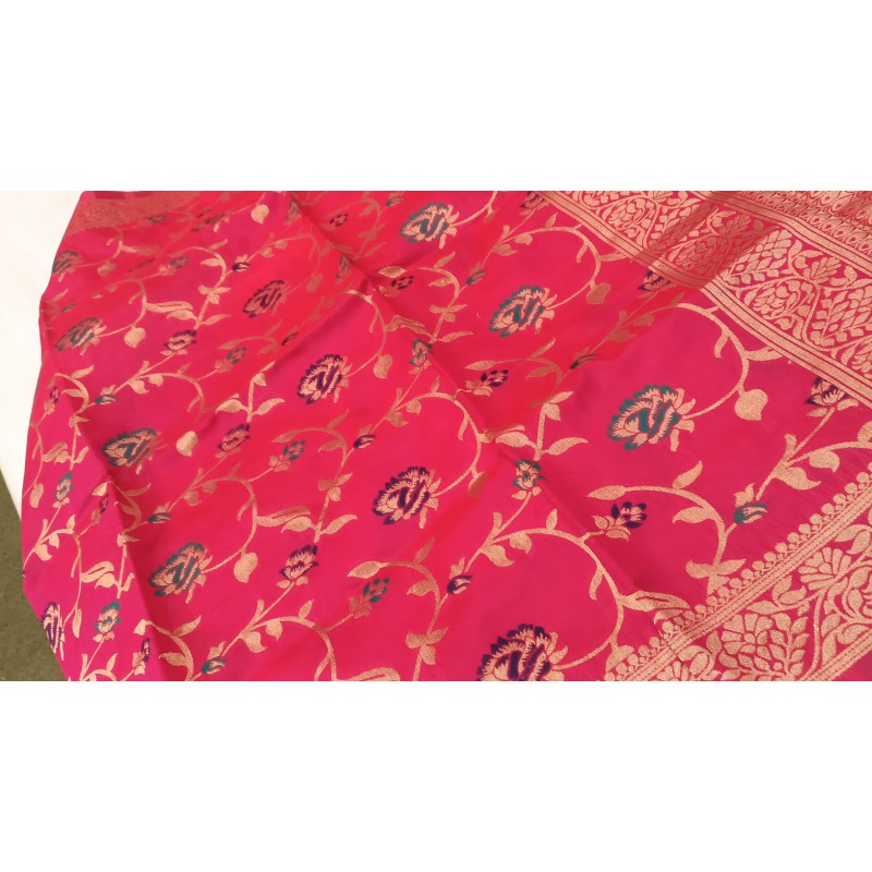Enhance your ethnic collection with our Premium Banarasi Multi colour flower Jaal all over Dupatta Fabric, a luxurious creation from the Banarasi weaving tradition. This elegant fabric is crafted from soft Katan silk, adorned with intricate zari buta (motifs) all over, and finished with a smooth Zari (border) that adds a royal touch. Perfect for sarees, suits, lehengas, and festive wear, this fabric reflects the timeless artistry of Banaras.