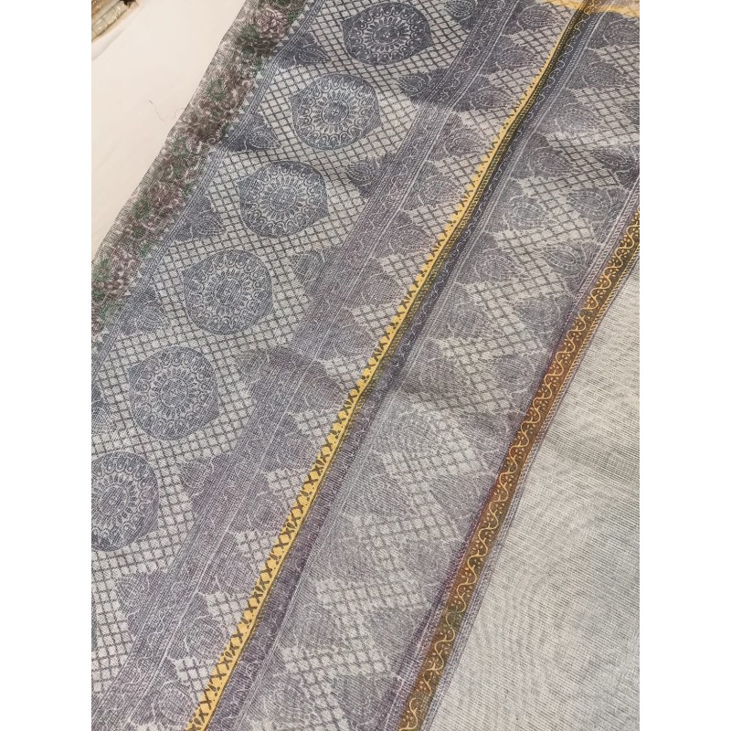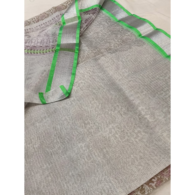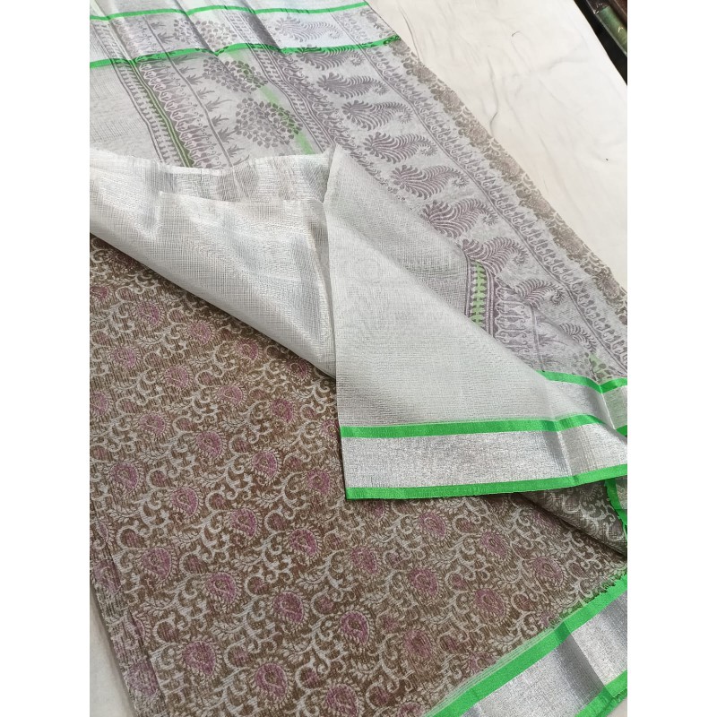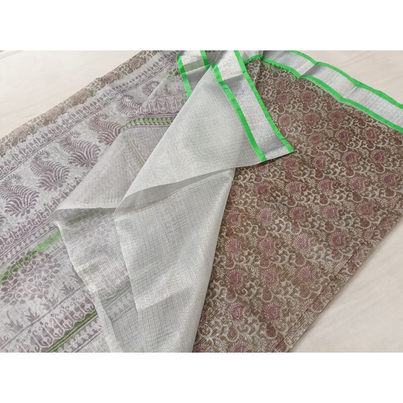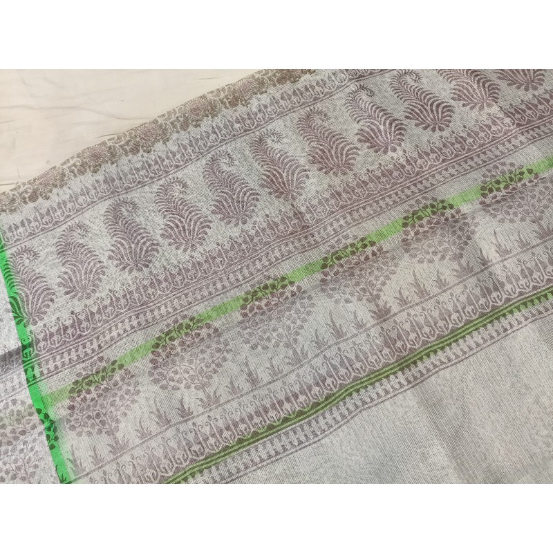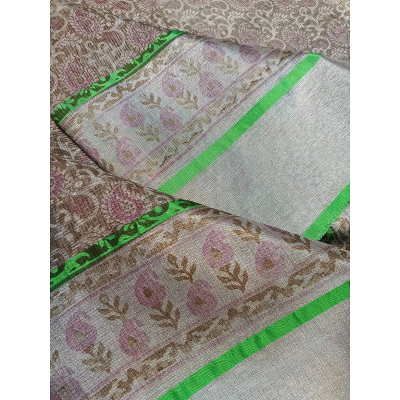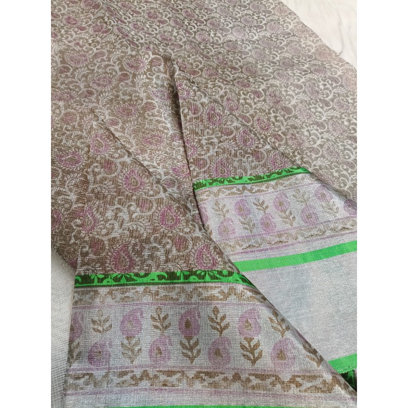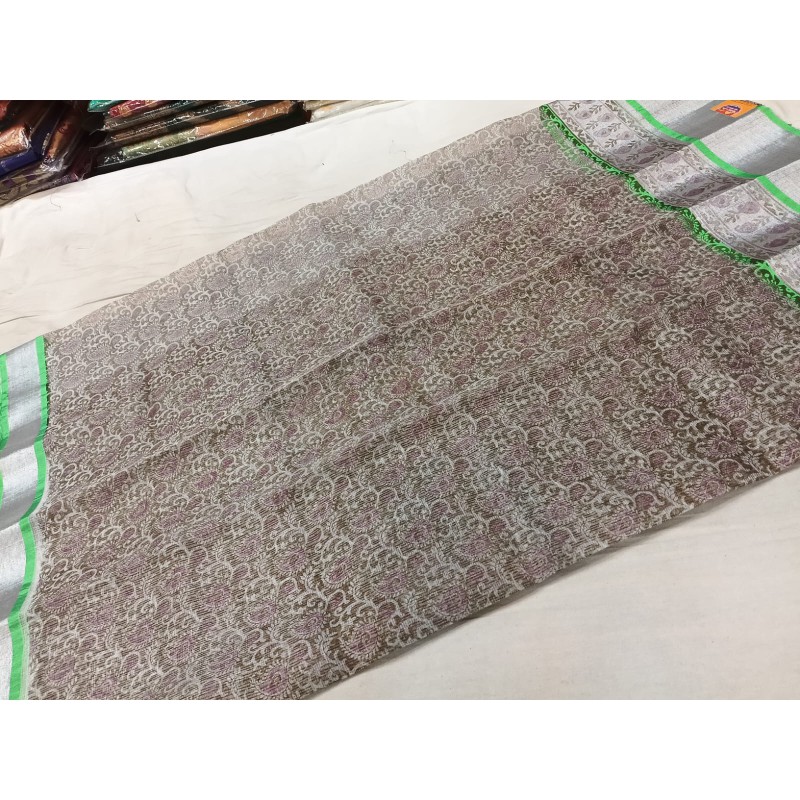 - Lustrous Appearance: The key feature is the subtle, natural sheen achieved by interweaving fine cotton threads with metallic or zari threads. This gives the saree a rich look without being overly flashy.