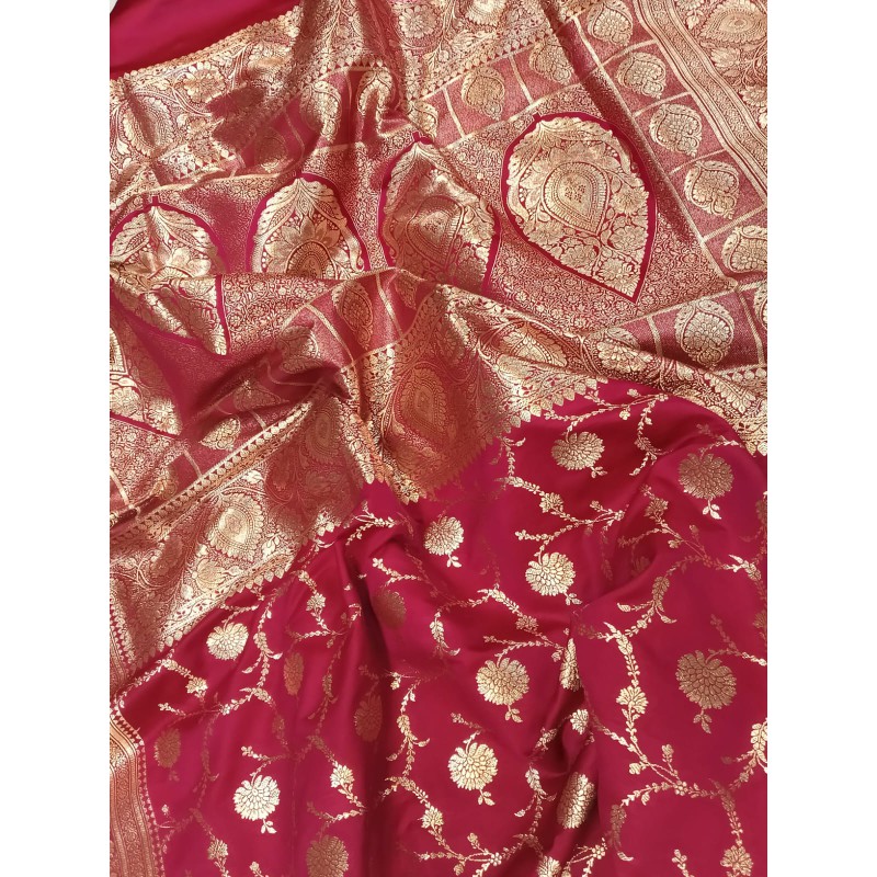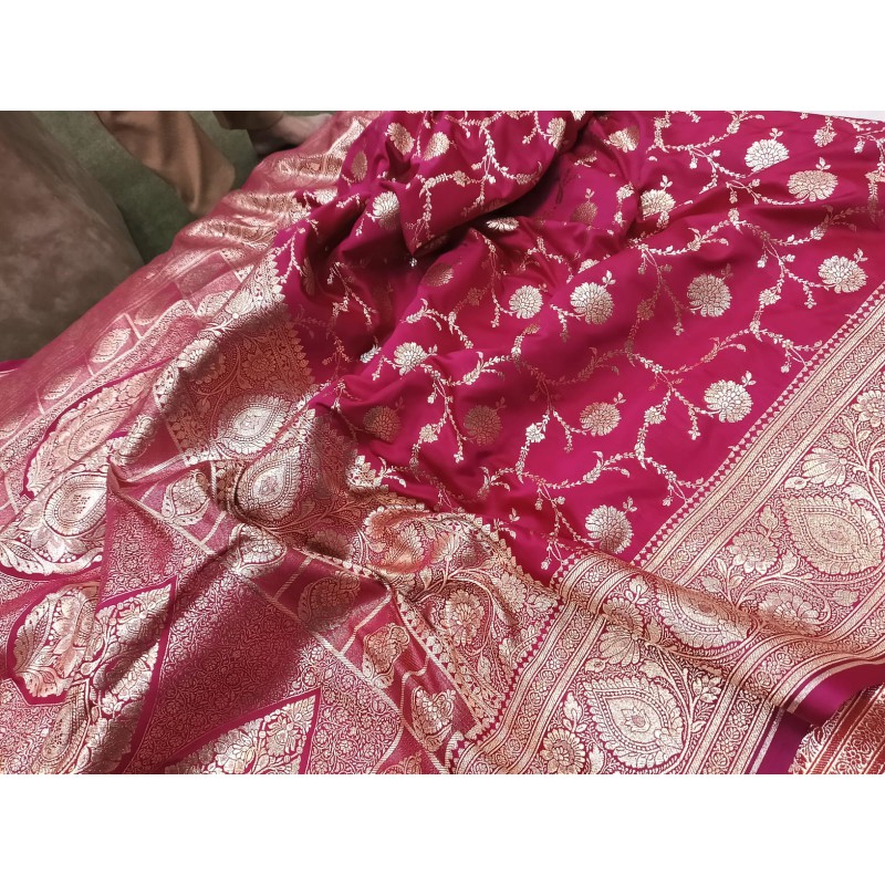 This saree is a Rani Pink Handloom Pure Katan Silk Banarasi Saree, known for its high-quality "pure katan silk" fabric. This specific piece features an intricate all-over handwoven jaal work pattern, often utilizing gold or silver zari to create detailed floral designs.