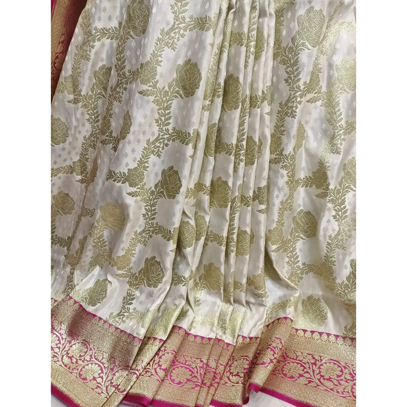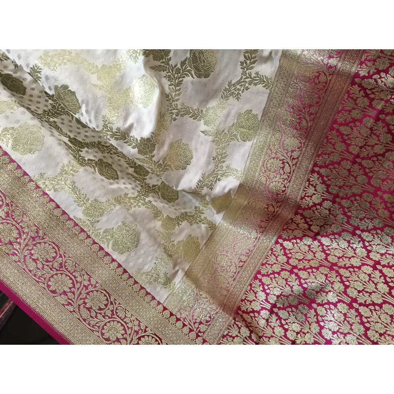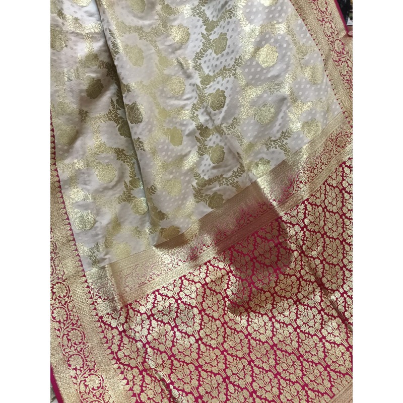 This saree is a Rani Pink Handloom Pure Katan Silk Banarasi Saree, known for its high-quality "pure katan silk" fabric. This specific piece features an intricate all-over handwoven jaal work pattern, often utilizing gold or silver zari to create detailed floral designs.