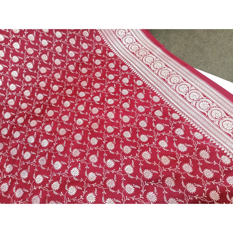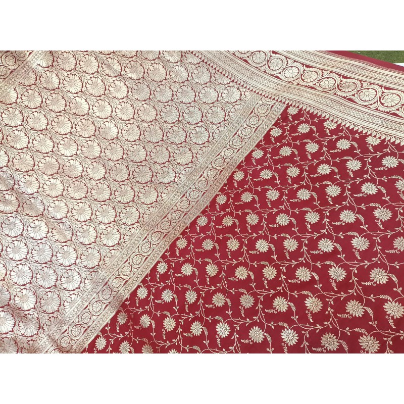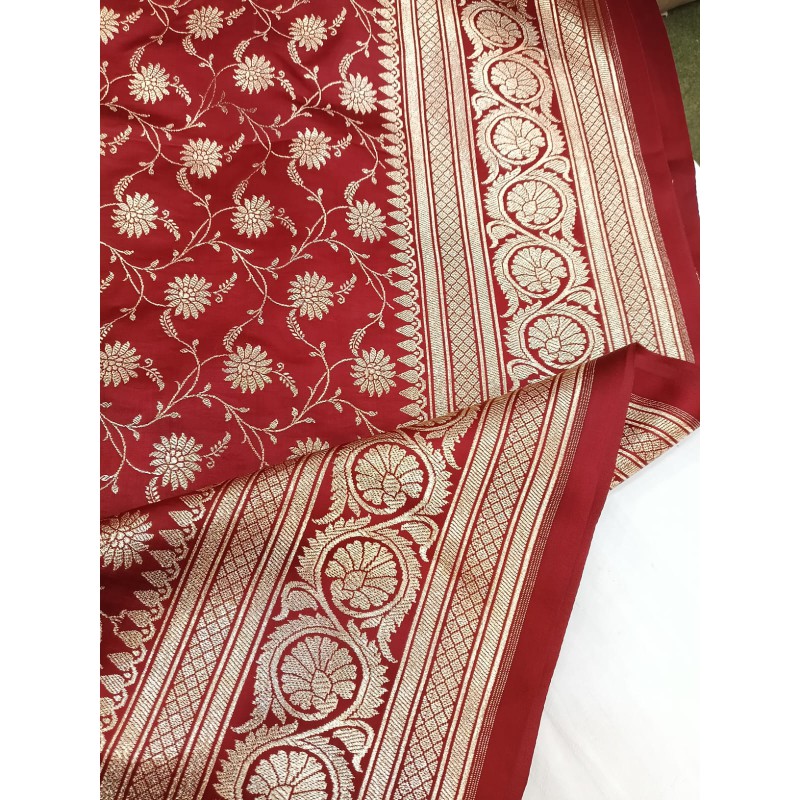 Design: Adorned with a dense floral jaal (mesh-like pattern) across the body, complemented by a heavy, traditional zari border and pallu.