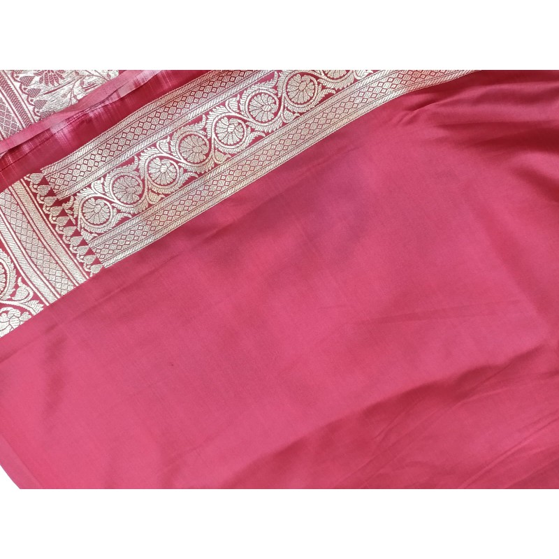 This saree is a Rani Pink Handloom Pure Katan Silk Banarasi Saree, known for its high-quality "pure katan silk" fabric. This specific piece features an intricate all-over handwoven jaal work pattern, often utilizing gold or silver zari to create detailed floral designs.