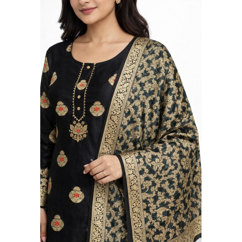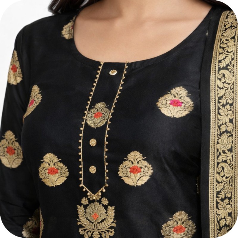 Silk Banarasi Suit – Grace Woven in Tradition Add a royal touch to your wardrobe with this exquis..